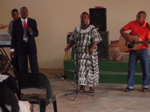 Musikken her i kirken var rytmemusik ved forskellige instrumenter og med præstens kone som forsanger i koret.