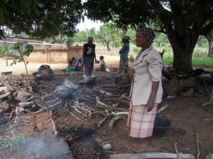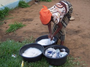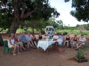 Efter denne fantastiske naturoplevelse til jorloddet kørte vi tilbage til Gildos hjem, hvor der blev serveret kaffe til medbragt brød. Nogle af pigerne sad under træet og ordnede nødder og passede børnene, en af pigerne havde storvask som foregik i 3 store baljer på jorden. Tørresnoren va busker som tøjet blev lagt på.