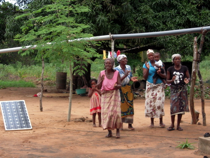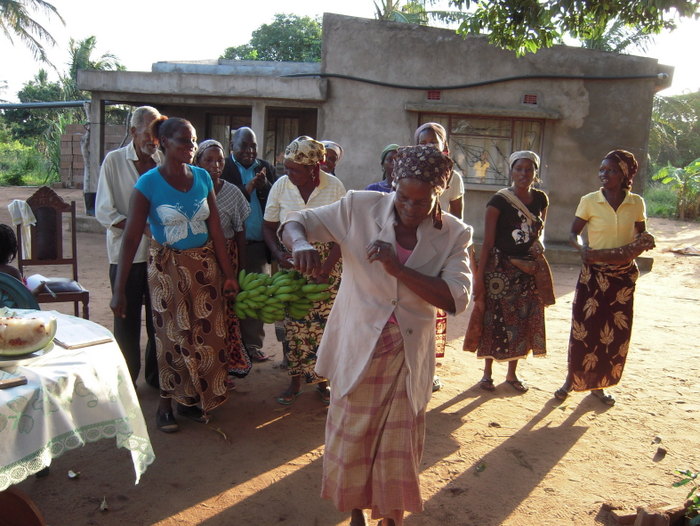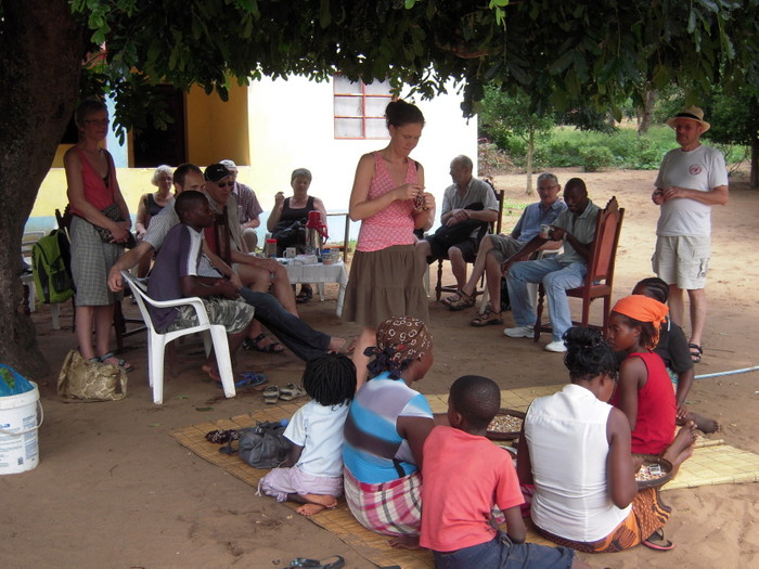 Da vi kørte ind på bopladsen og steg ud af bilen, blev vi modtaget med sang, begejstring og kys af 6 kvinder med gamle mor i spidsen. Her boede Alcinio, som var en af de første elever på landbrugsskolen. Her boede han sammen med kone, barn og mor. Hans 2 brødre som arbejdede i Sydafrika hjalp familien økonomisk. Brødrene boede i et muret hus, når de var hjemme. Gamle mor boede i en rund afrikansk hytte, mens Alcinio med familie boede i et stort hus lavet af flettet hegn.