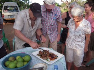 Vi skulle spise frokost klokken 13:00 under det store træ, hvor spisebordet og plastikstolene stod. Klokken 14:00 fik vi vandmelon og appelsiner fra marken. Vi danske gik lidt i stå da der ikke skete mere. Derfor gik vi til bålpladsen, hvor pigerne havde travlt med at forberede frokosten til os. Gamle mor gik efter brænde, og tændte bål for at ristede castanha . Herefter blev castanha banket og nødderne faldt ud. Sidste proces inden ristning på panden var at skalden skulle pilles af.