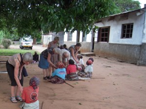 Arbejdsholdene fordelte sig. Mændene til landbrugsskolen hvor de fortsatte med byggeriet, og vi piger kørte til kirken hvor vi fortsatte med at undervise i syning og strikning.
