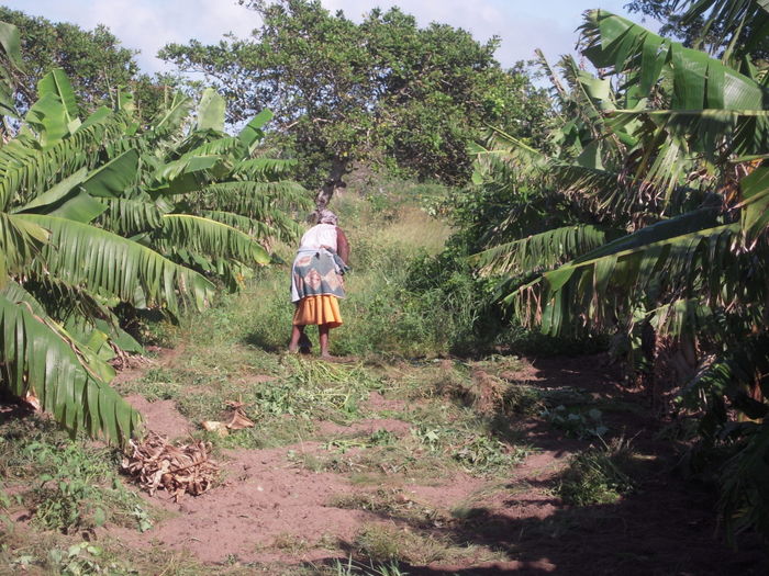 Skolen har ansat 10 kvinder til at hjælpe med at luge og hakke mellem bl.a. bananpalmer ingen forårs såning . Kvinderne er glade trods hårdt arbejde og lille dagløn.