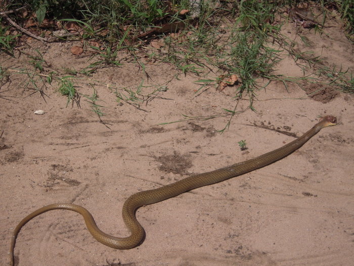 Pludselig opstod der stor uro på pladsen. Der blev banket i jorden og inden nogen af os ænsede noget som helst lå der en slange på jorden. Slangen på 1.60 m var i færd med at spise en rotte, da den blev dræbt.