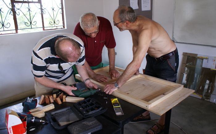 Kvinderne var med ude på landbrugskolen idag, der blev savet ud til værktøjsskasse, tørrehus malet endnu engang.