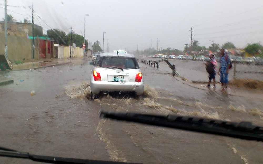 Vi har aftalt møde på Den danske Ambassade i Maputo kl. 14. Samtidig med at vi nærmer os byen, trækker store mørke skyer op på himmelen. Pludselig vælter regnen ned. Vejene omdannes til floder, omgivet af store og små vandfald – vandet står op af kloakkerne, vi er omgivet af store søer.