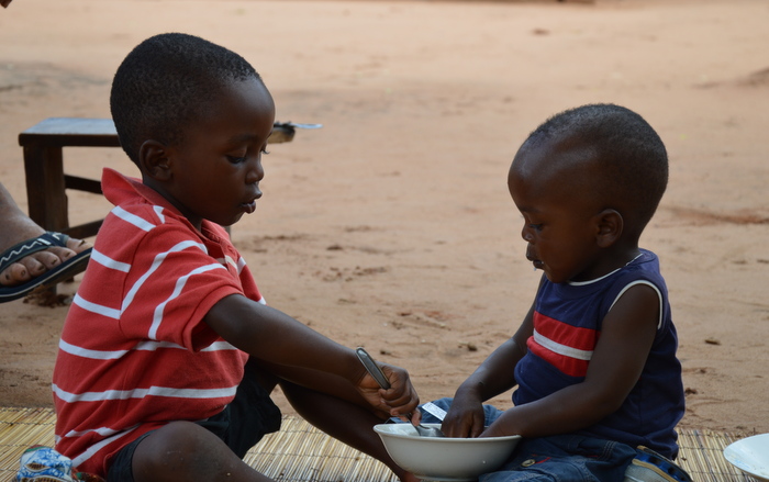 Midt på gårdspladsen var der dækket fint op til os. Vi blev trakteret med kogt og grillet pattegris – godt med flæsk. Tilbehør ris, majsgrød, grønt sovs af manijokblade.