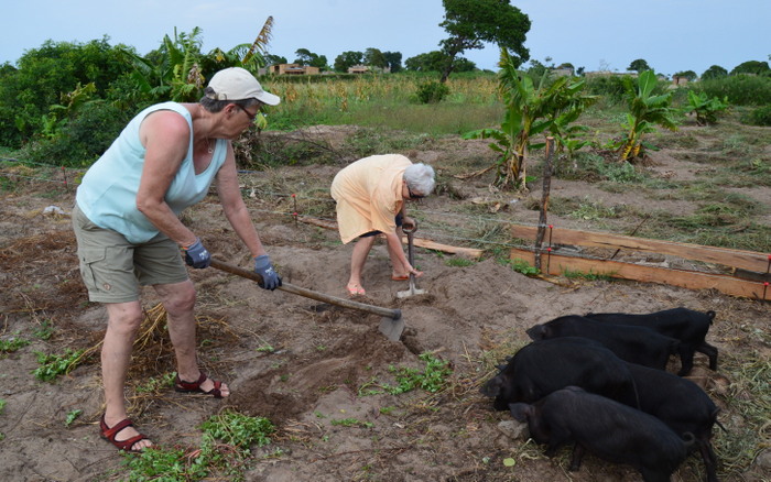 Kvinderne malede skiltet færdigt og fik gravet basinet op, så grisene er klar til vandbad.