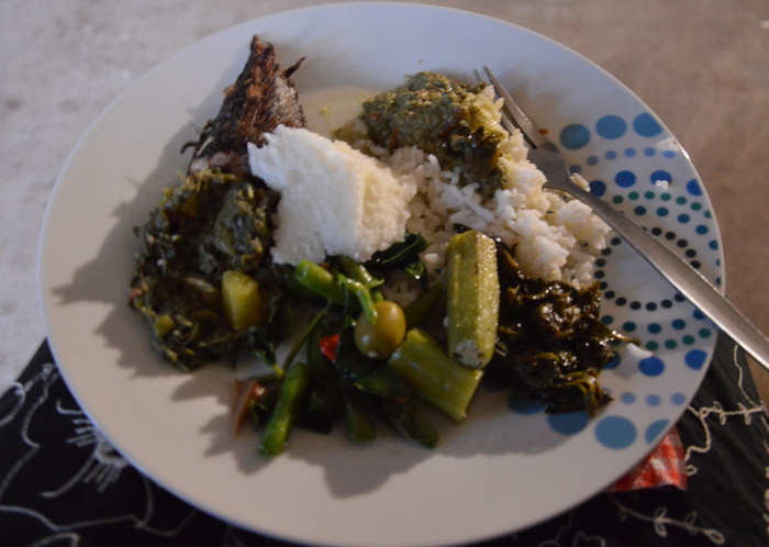 Vi fik fisk og mange f.sk. lokale retter (blade, bønner m.m.)