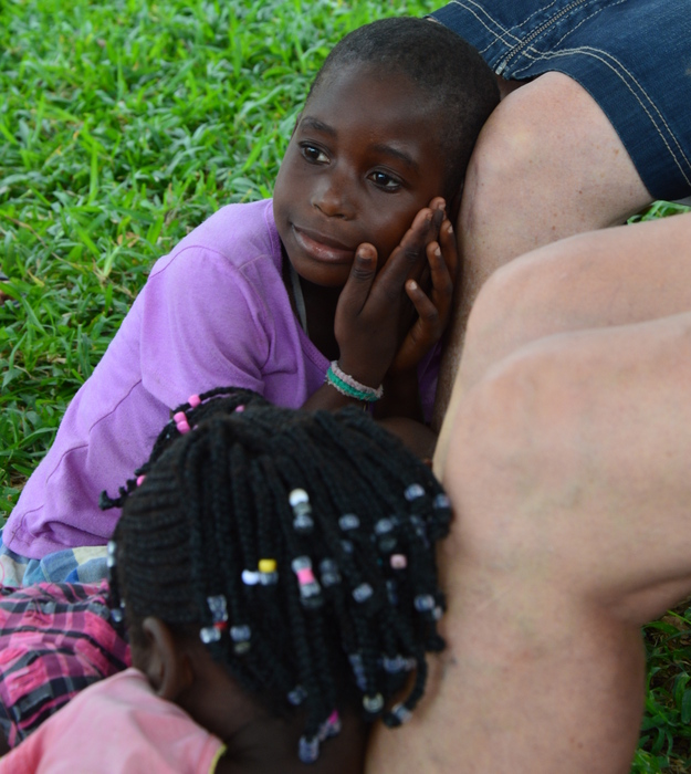Børnene fra landsbyen kikker først på afstand men senere kommer de tættere på og elsker til sidst de hvide mormorben.