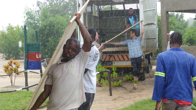 Arbejdsdagen blev anderledes end forventet, da det regnede rigtigt meget. To mænd kørte til trælasten fra morgenen af og materialerne blev leveret inden middag – i kraftig regnvejr.