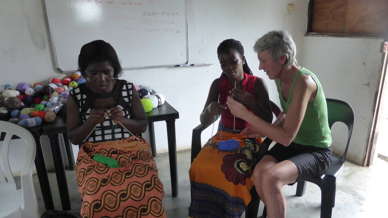 Pigerne begyndte strikkeundervisning for tre lokaler kvinder under træet, men flyttede hurtigt ind i skolestuen på grund af regnvejret.