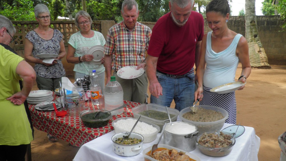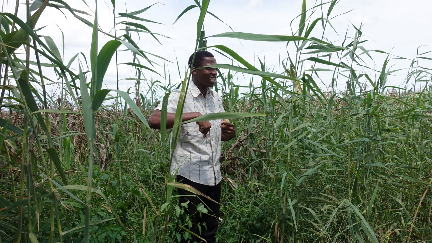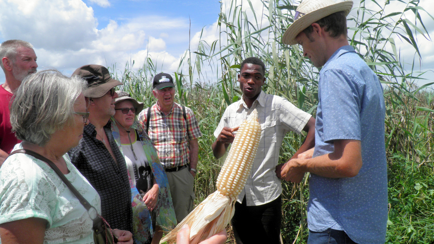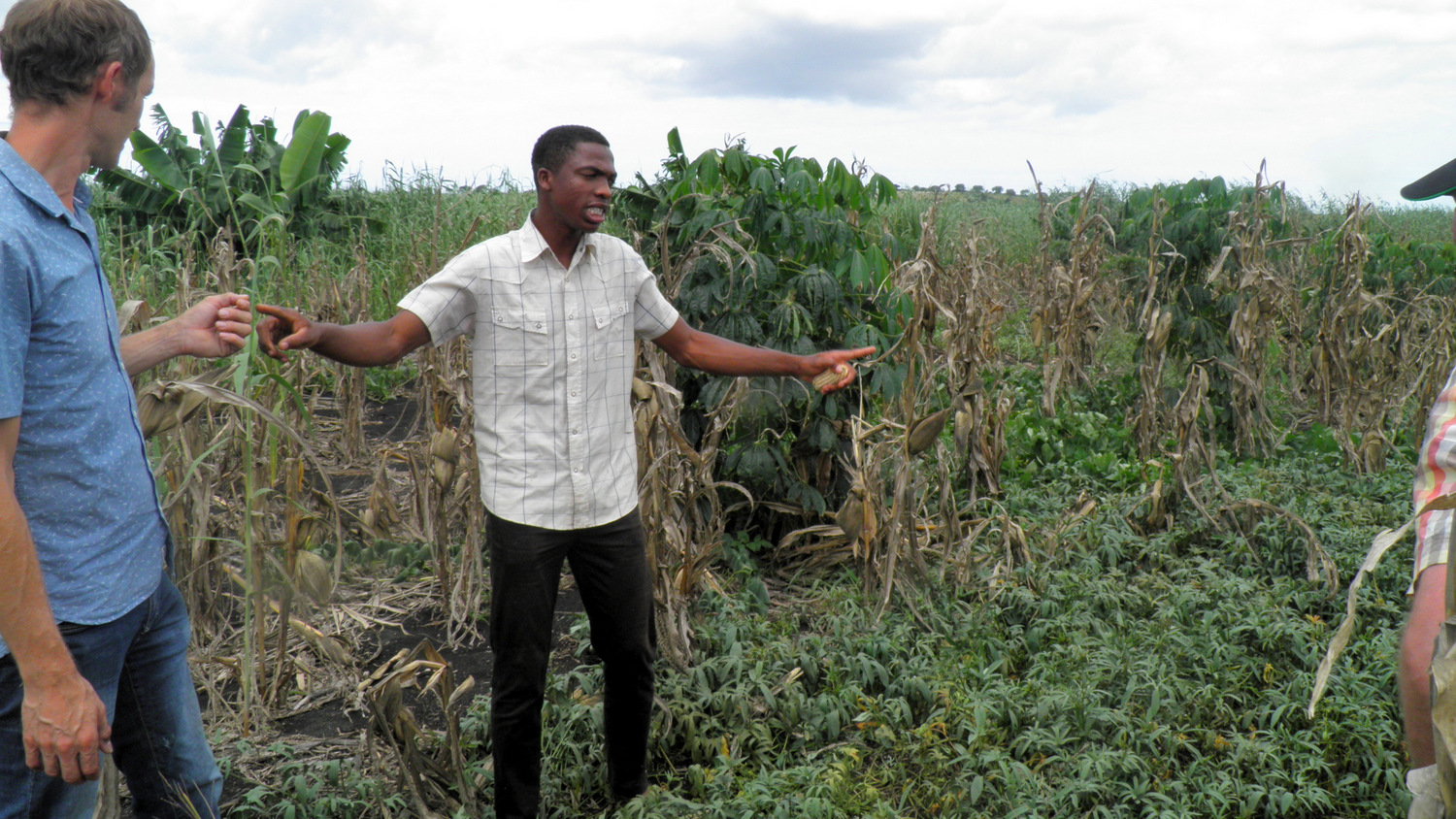Efter et kig i stalden gik turen ud til hans 19 parceller af hver en ½ hektar spredt ud over et stort område. Han dyrker, majs, maniok, flere forskellige typer bønner, foruden kål, bananer og søde kartofler. Han gøder med eget komposteret husdyrgødning, som bæres i kurve på hovedet. De to timers gang ud til parcellerne. Når markerne bliver høstet bæres afgrøderne tilbage på same måde. Såning, plantning og renholdelse sker med håndkraft. Alt det fysiske arbejde udføres af hans mor, og grundet uddannelsen kan han kun arbejde I weekenden.