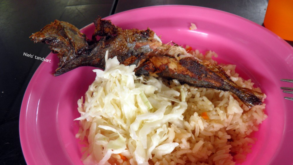 Efter en god arbejdsdag spiste vi frokost med ris og fisk; carapau. Specielt hovedet var en delikatesse, som smagt godt, selvom det krævede lidt overvindelse.