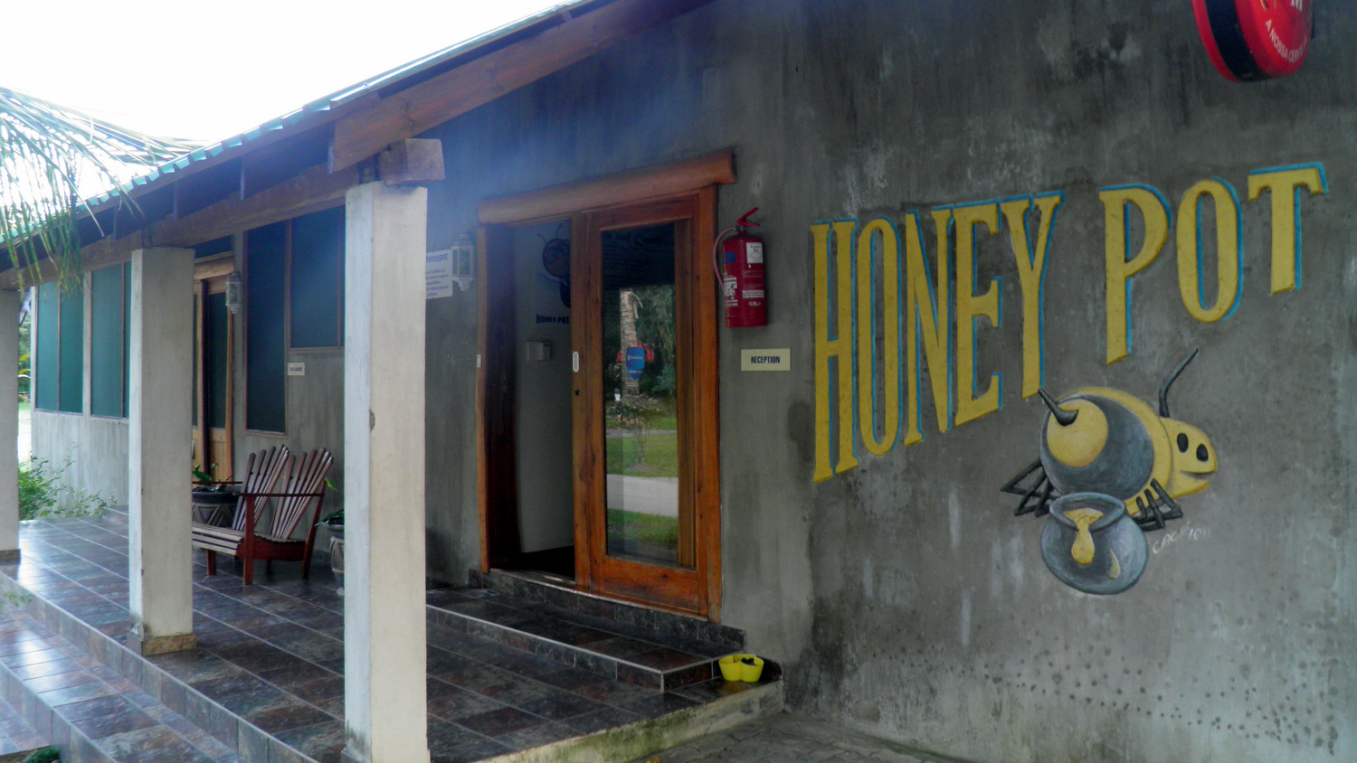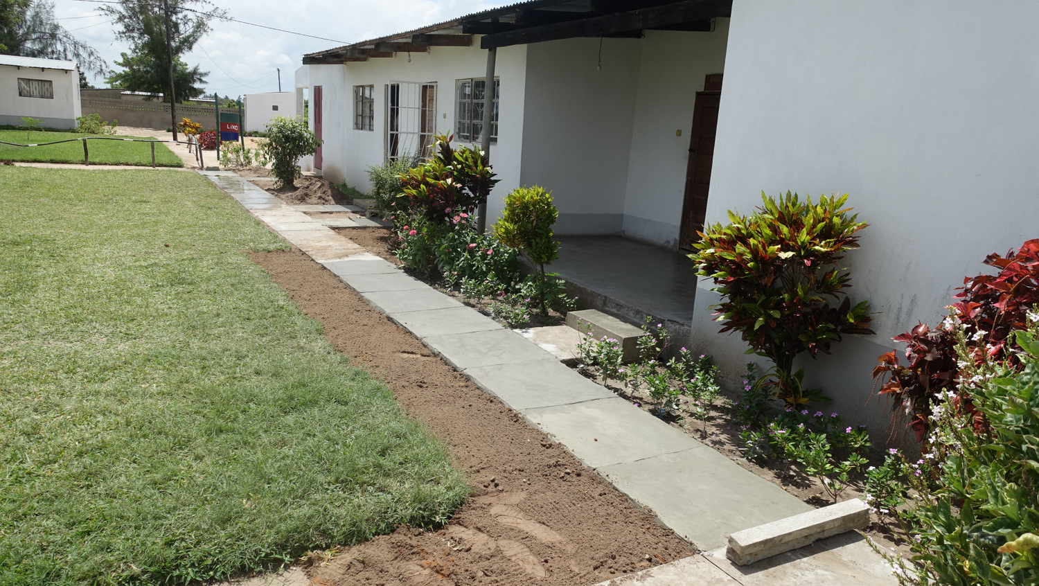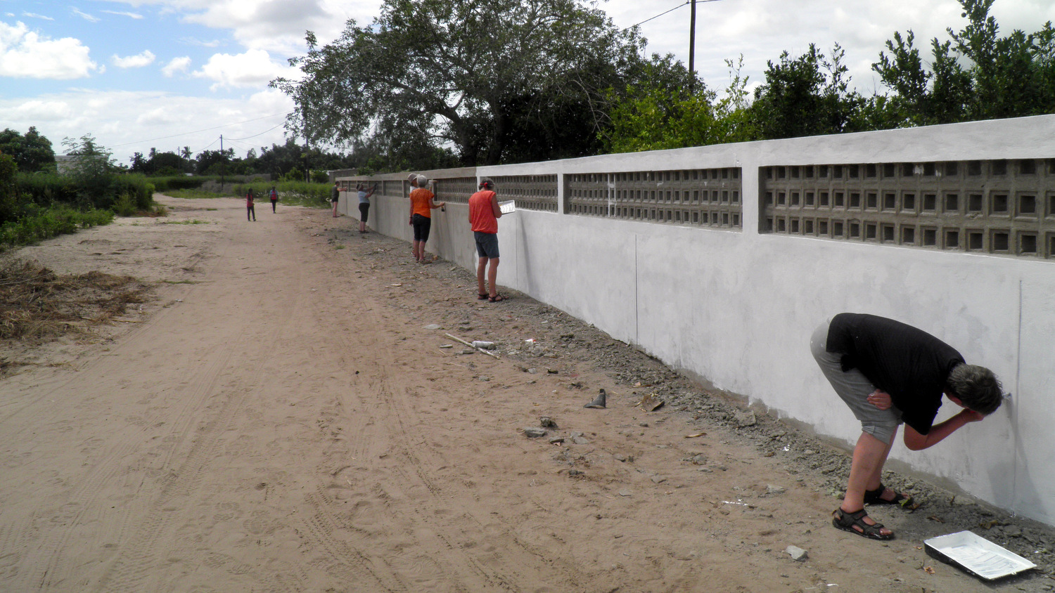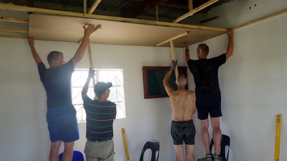 Hele formiddagen blev der igen arbejdet på fuld kraft på skolen med maling af det flotte indgangsparti, opsætning af loft i kontoret, og de sidste fliser er blevet støbt.