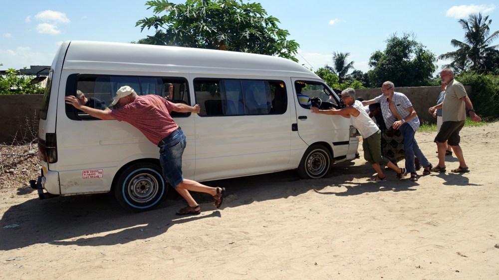 Selv i Maputo er der sandveje. Det var lige ved at give os problemer, da vi skulle have vendt vores bil med traileren fyldt med kufferter. Der måtte et hjælpende skub til for at komme videre!
