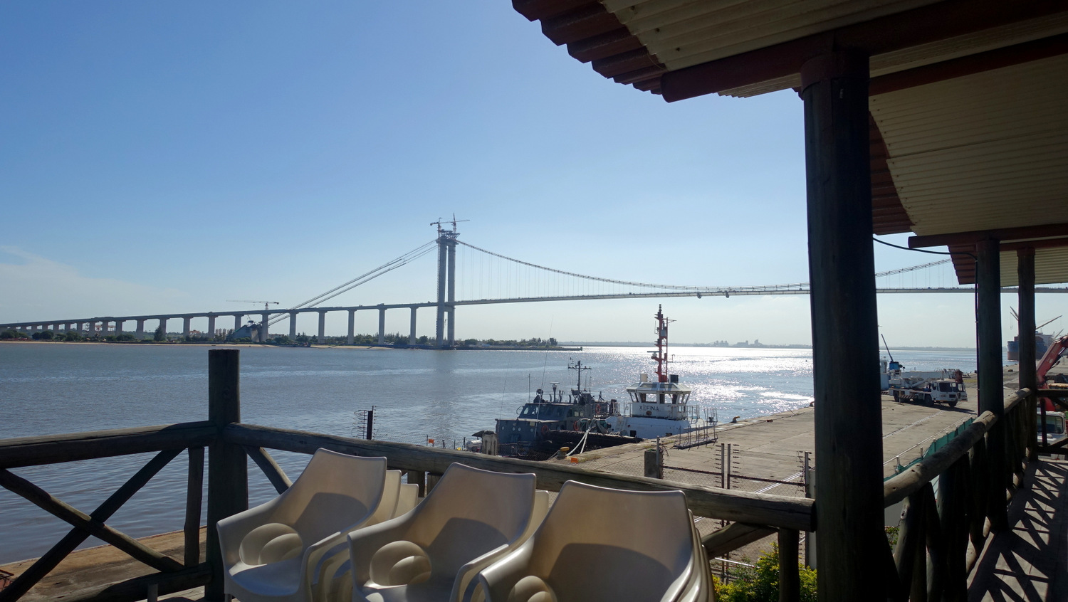 Eftermiddagskaffen fik vi på en dejlig restaurant lige ned til havnen, hvor vi kunne nyde udsigten til en kæmpe bro, der er ved at blive bygget af Kinesere.