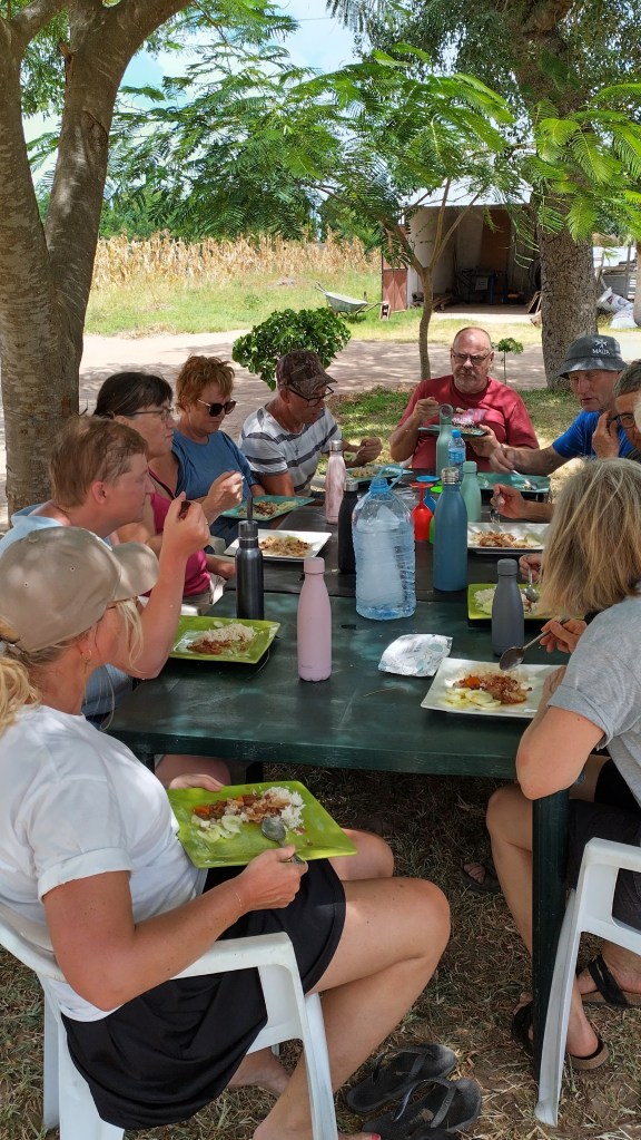 Det er hårdt at arbejde i varmen, så vi er trætte når vi når frokosttid.