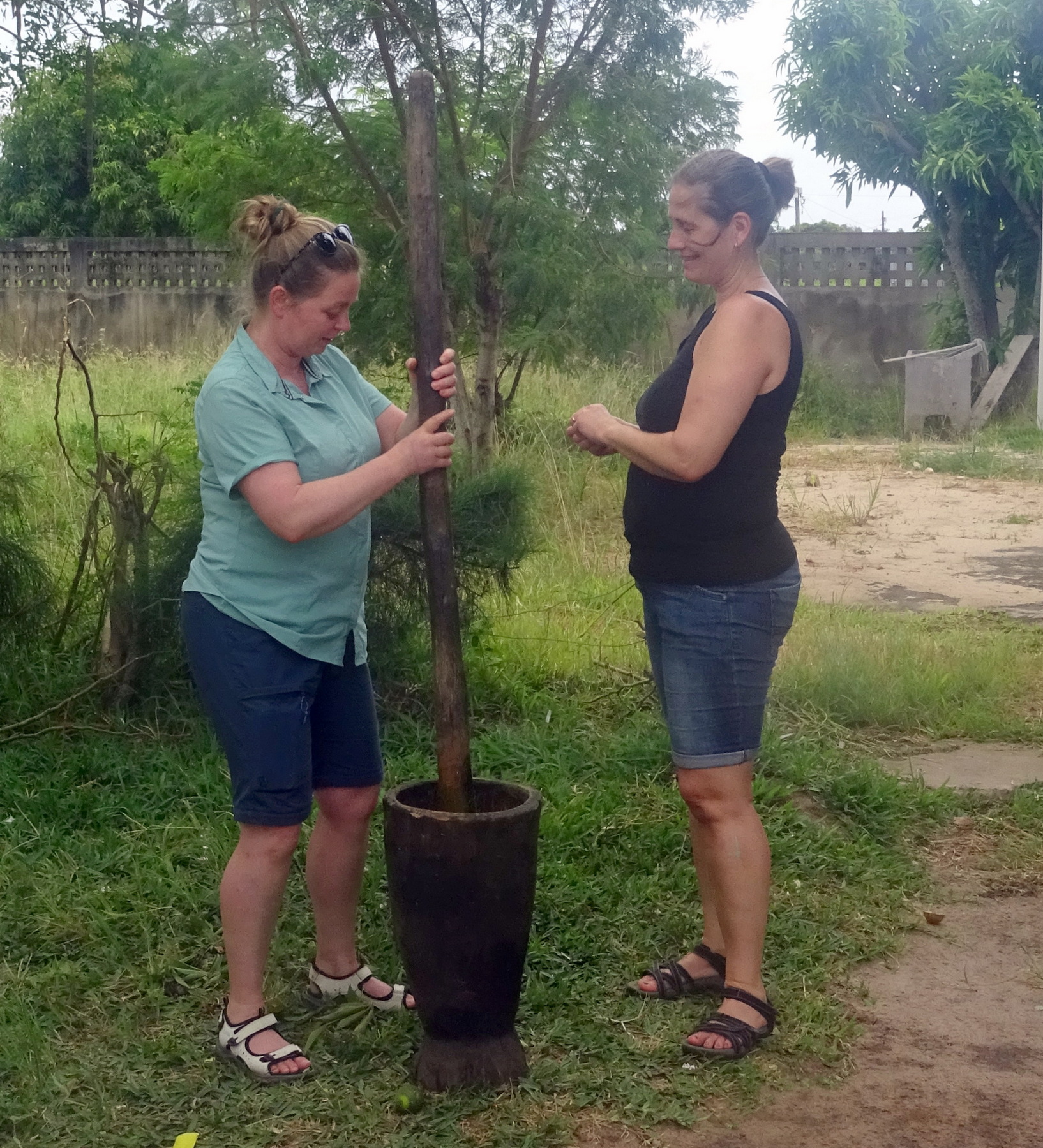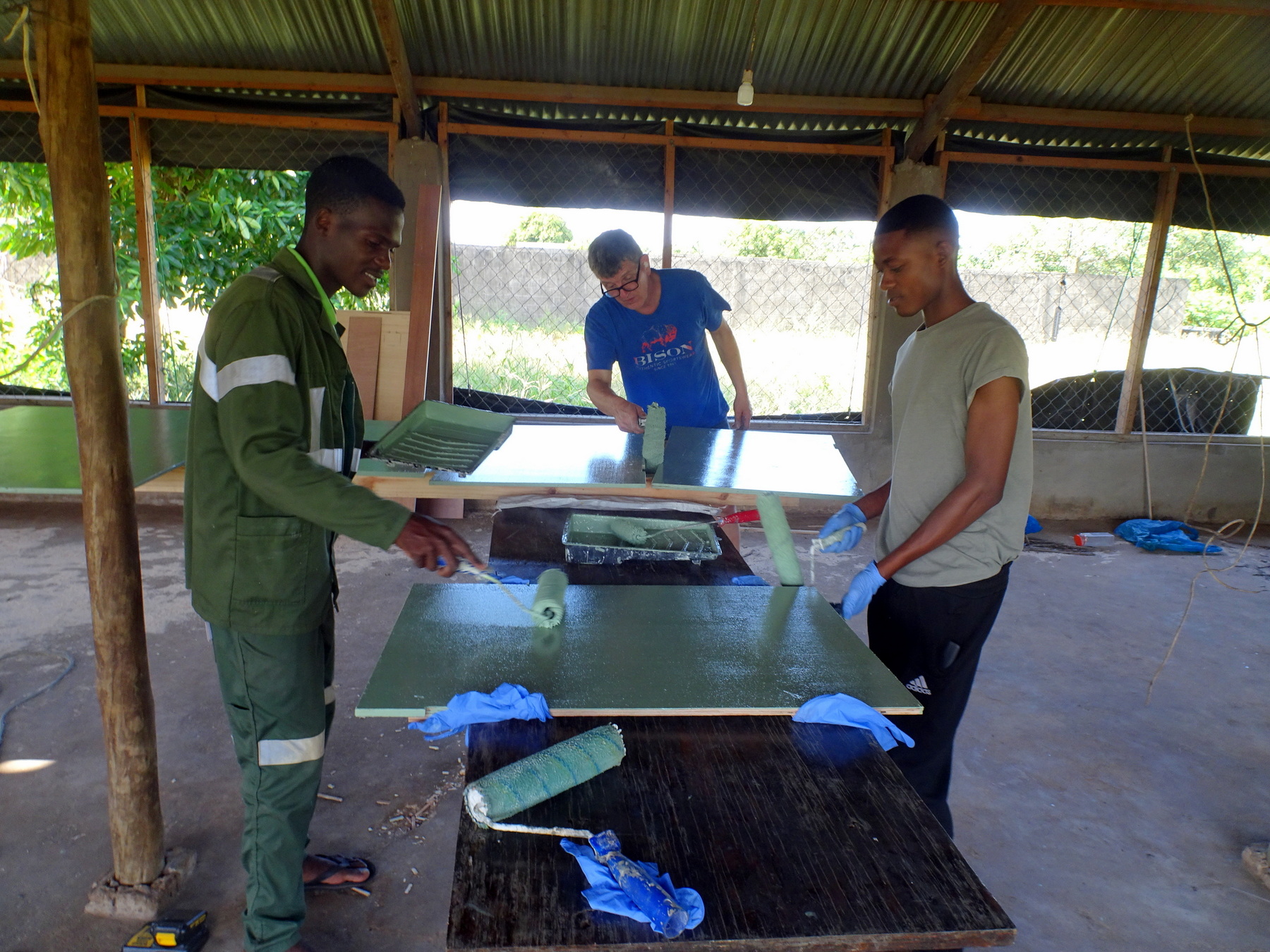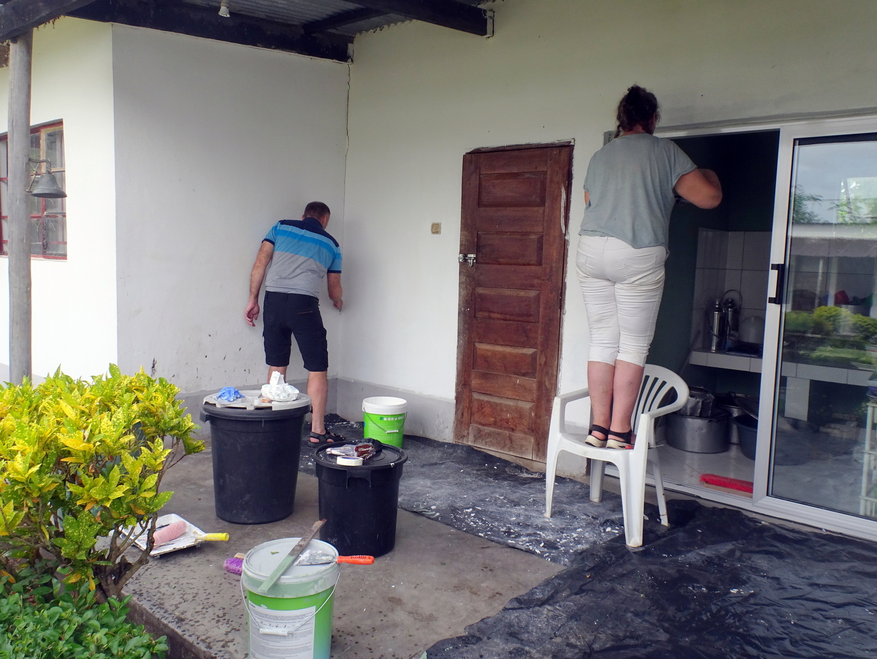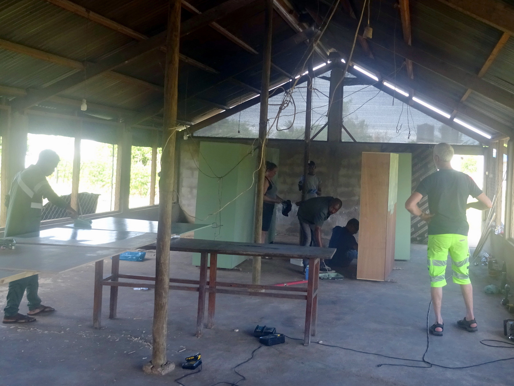Skolen føltes tom, nu da eleverne ikke længere er på skolen, men samtidigt giver det os en god mulighed for virkelig at få noget fra hånden. 50+ deltagerne fordelte sig hurtigt på div. arbejdsopgaver, så allerede til frokost var det tydeligt for enhver, at der var blevet arbejdet ihærdigt; køkkenet var malet støvet grønt og opbygningen af skabe var under udvikling. Malingen af murene udendørs var udfordret af regnbyger fra tid til anden, men var ved godt mod.